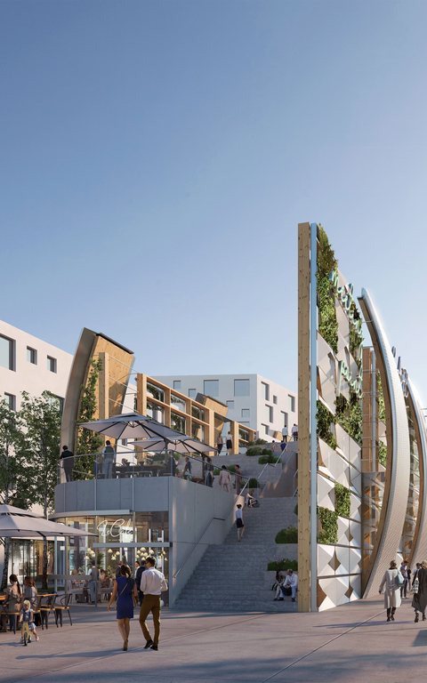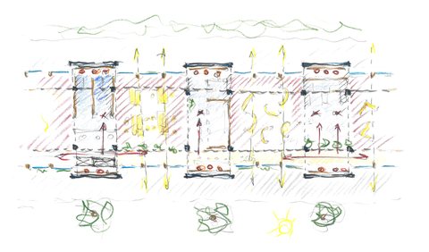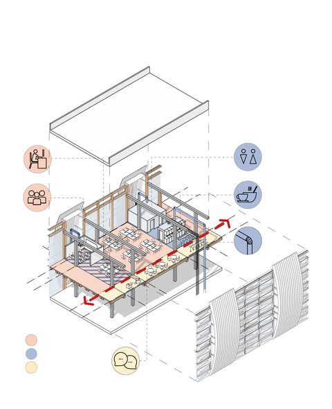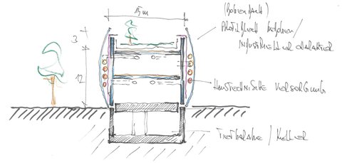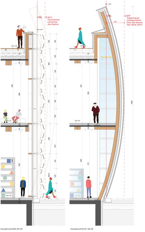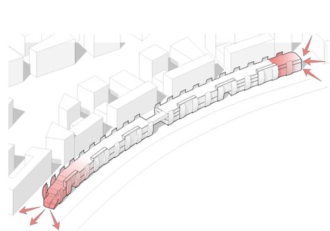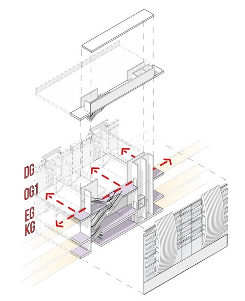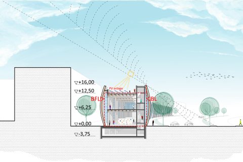 Außen liegende und regelmäßig wiederkehrende „Bögen“ bilden für das Gebäude selbst, aber auch hinsichtlich des städtebaulichen Maßstabs eine „Klammer“. Funktional markieren die Bögen Versorgungs- und Erschließungsbereiche der baulichen Anlage.