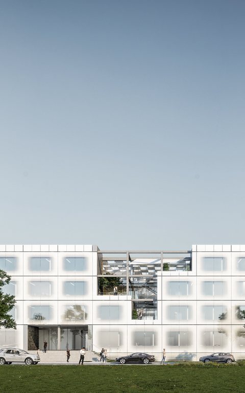 The building consists of 2 core areas, externally aligned office units, a central airspace with single conference-, meeting-, and social zones with significant communication and view axis inside the buildings and spacious, free areas integrated in the cubage.